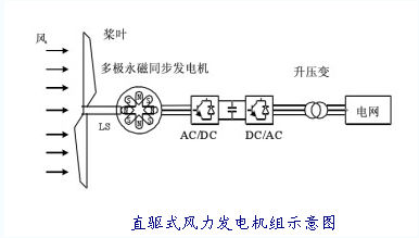 直驅(qū)式風(fēng)力發(fā)電機(jī)組的風(fēng)輪直接驅(qū)動(dòng)發(fā)電機(jī),主要由風(fēng)輪、傳動(dòng)裝置、發(fā)電機(jī)、控制系統(tǒng)等組成。為了提高低速發(fā)電機(jī)效率,直驅(qū)式風(fēng)力發(fā)電機(jī)組采用大幅度增加極對(duì)數(shù)(一般極數(shù)提高到100左右)來(lái)提高風(fēng)能利用率,采用全功率變流器實(shí)現(xiàn)風(fēng)力發(fā)電機(jī)的調(diào)速。