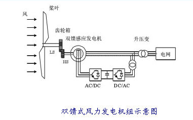 雙饋式風(fēng)力發(fā)電機(jī)組的系統(tǒng)將齒輪箱傳輸?shù)桨l(fā)電機(jī)主軸的機(jī)械能轉(zhuǎn)化為電能,通過(guò)發(fā)電機(jī)定子、轉(zhuǎn)子傳送給電網(wǎng)。發(fā)電機(jī)定子繞組直接和電網(wǎng)連接,轉(zhuǎn)子繞組和頻率、幅值、相位都可以按照要求進(jìn)行調(diào)節(jié)的變頻器相連。變頻器控制電機(jī)在亞同步和超同步轉(zhuǎn)速下都保持發(fā)電狀態(tài)。在超同步發(fā)電時(shí),通過(guò)定轉(zhuǎn)子兩個(gè)通道同時(shí)向電網(wǎng)饋送能量,這時(shí)逆變器將直流側(cè)能量饋送回電網(wǎng)。在亞同步發(fā)電時(shí),通過(guò)定子向電網(wǎng)饋送能量、轉(zhuǎn)子吸收能量產(chǎn)生制動(dòng)力矩使電機(jī)工作在發(fā)電狀態(tài),變流系統(tǒng)雙向饋電,故稱雙饋技術(shù)。