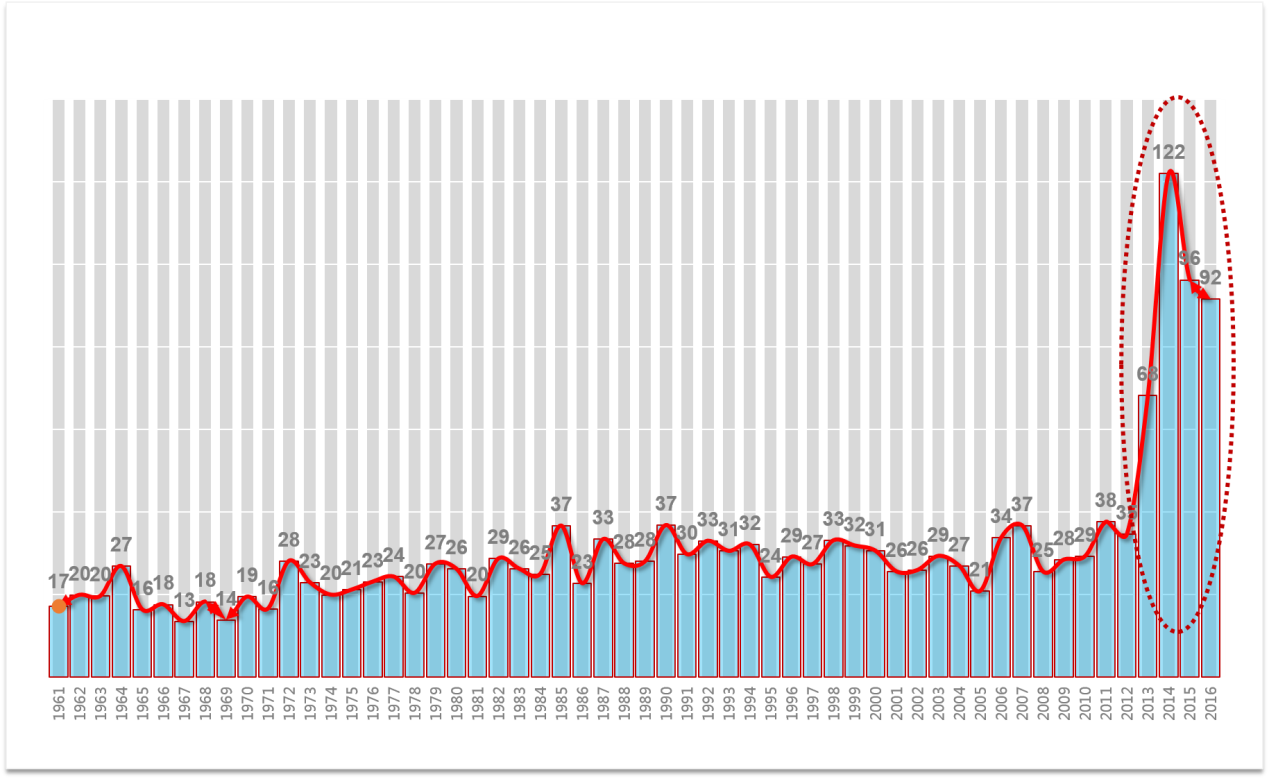 圖:山東省歷年霧天數(shù)和霾天數(shù)之和,2013年之后是明顯的突變
