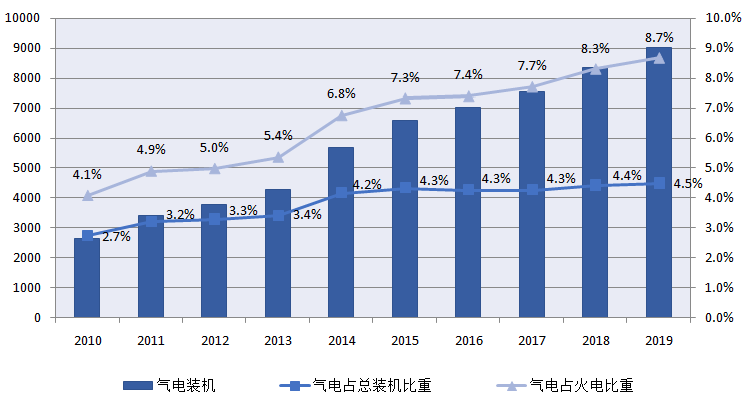 自2010年以來,氣電產(chǎn)業(yè)雖然經(jīng)歷了天然氣供應階段性緊張、氣價上揚、電力需求增速放緩等不利因素的影響,但整體仍發(fā)展較快。圖2顯示,氣電裝機容量自2010年至今已增長240%。但由于同期風電、光伏發(fā)電的迅猛發(fā)展,使得氣電在總裝機容量的比重增長并不明顯,特別近5年基本維持在4.3%~4.5%。但氣電在火電裝機的比重卻保持了較為明顯的增長態(tài)勢,由2010年的4.1%增長為2019年的8.7%,表明氣電作為低碳清潔能源在我國能源結(jié)構(gòu)調(diào)整和低碳轉(zhuǎn)型中地位越來越重要。