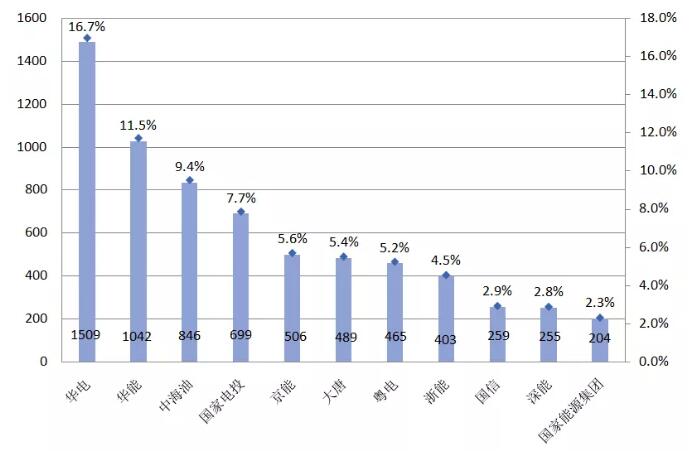我國氣電裝機容量中以五大發(fā)電集團為主,約占全國總裝機容量的50%。其中華電、華能裝機規(guī)模較大,截至2019年分別達到1509萬千瓦和1042萬千瓦(分別占氣電總裝機的16.7%、11.5%)。中海油依托上游天然氣產(chǎn)業(yè)的優(yōu)勢,擁有846萬千瓦裝機。此外,京能、深圳能源、浙能和粵電等地方發(fā)電企業(yè)的氣電裝機也分別達到了506萬、225萬、403萬和465萬千瓦(如圖4所示)。