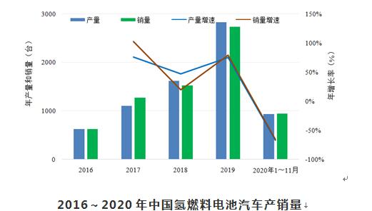 2016~2019年,我國燃料電池汽車產(chǎn)銷量穩(wěn)步上升;2020年受疫情影響產(chǎn)銷量同比有所下降,前11個月產(chǎn)銷量分別為935輛和948輛。截至目前,我國燃料電池汽車保有量約7200輛,以中型貨車和大中型客車為主,累計運(yùn)營里程接近1億公里;上海、深圳和佛山投放車輛均超過千輛。