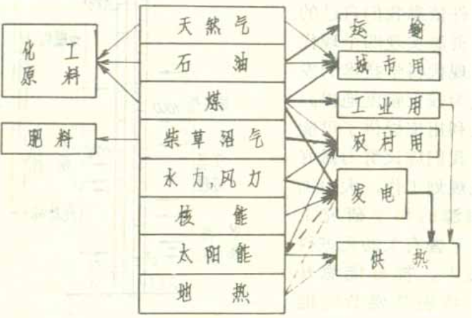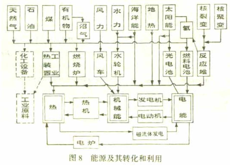 圖8表示各種能源經(jīng)過(guò)各種設(shè)備把它們轉(zhuǎn)化為各種不同形式的能來(lái)使用。圖的左邊是各種能源,右邊是各種使用形式,中間是各種轉(zhuǎn)化過(guò)程。從上面往下,天然氣、石油、煤、有機(jī)物(如薪炭、農(nóng)作物秸稈)都是常規(guī)能源,水力和風(fēng)力也算是常規(guī)能源。