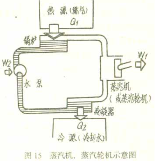 圖15是十八世紀(jì)末才趨于完善的人類發(fā)明創(chuàng)造的第一種熱機(jī)——蒸汽機(jī)的示意圖。煤或其它燃料,在鍋爐中燃燒后產(chǎn)生高溫燃?xì)鈧鳠峤o水,獲得具有一定壓力和溫度的蒸汽。蒸汽進(jìn)入氣缸,在膨脹過(guò)程中,推動(dòng)活塞,再通過(guò)連桿、轉(zhuǎn)動(dòng)曲柄軸,輸出機(jī)械功。膨脹后蒸汽的壓力和溫度降低,在冷凝器中凝結(jié)成水,再用水泵打回到鍋爐中。這樣構(gòu)成了可以不斷重復(fù)進(jìn)行的循環(huán)過(guò)程,稱為熱力學(xué)循環(huán)。水或蒸汽在蒸汽機(jī)裝置中,經(jīng)過(guò)高溫燃?xì)鈱?duì)它傳熱(Q)后,內(nèi)能升高了。當(dāng)它從高壓向低壓膨脹時(shí),內(nèi)能降低而對(duì)活塞輸出機(jī)械功(W)。水或蒸汽是蒸汽機(jī)使用的工作介質(zhì),叫做工質(zhì)。我們把工質(zhì)作為體系,如果考慮它進(jìn)行了一個(gè)熱力學(xué)循環(huán),回到原來(lái)的狀態(tài),內(nèi)能沒(méi)有變化(即△E=O),則W=W-W=Q=Q-Q這就是說(shuō),蒸汽機(jī)活塞的輸出功減去輸給水泵的功,恰好等于從燃?xì)鈧鹘o工質(zhì)的熱量減去工質(zhì)傳給冷卻水的熱量。