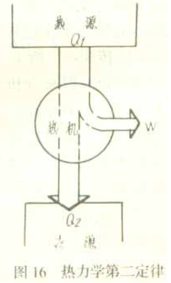 除了第一定律以外,分析熱機(jī)很重要的是熱力學(xué)第二定律,能源充分利用與否還要用熱力學(xué)第二定律。下面用圖16來(lái)說(shuō)明熱力學(xué)第二定律。