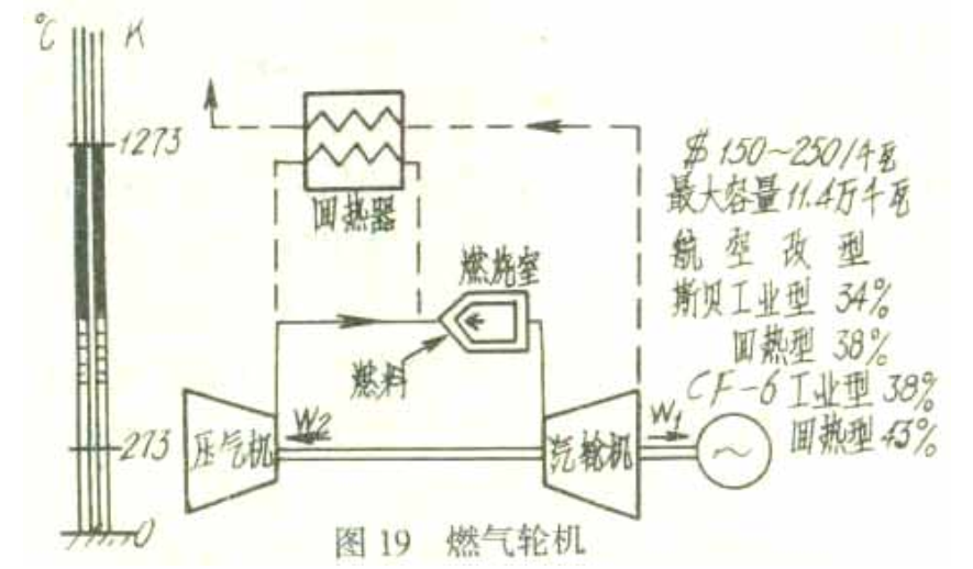 圖19表示一個(gè)不帶回?zé)崞骰蛘邘в谢責(zé)崞鞯娜細(xì)廨啓C(jī)的示意圖。上邊講了,空氣先通過(guò)壓氣機(jī),提高壓力,再到燃燒室,提高溫度,最后到氣輪機(jī)膨脹輸出功,它的工作溫度范圍表示在左邊的溫度圖上。