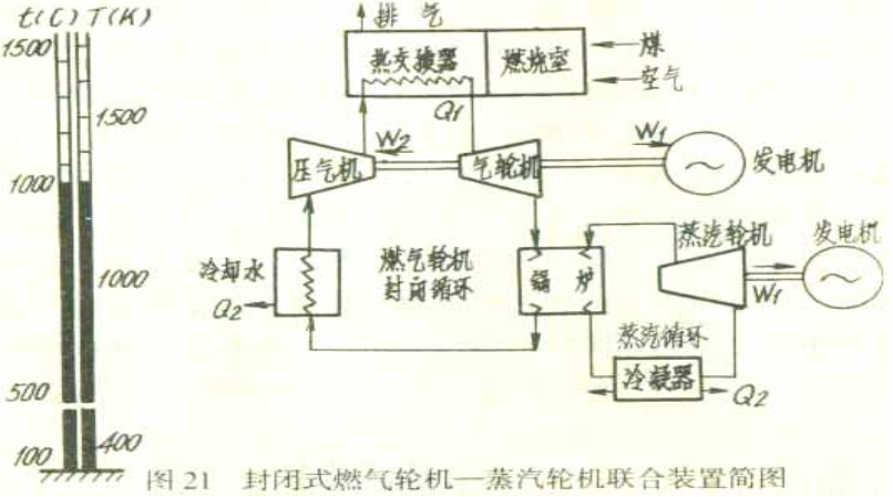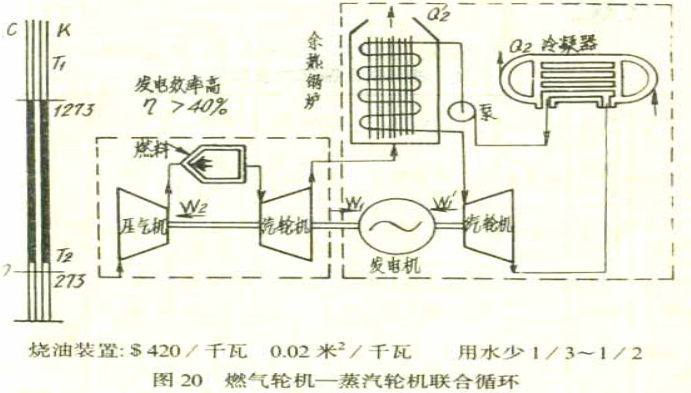 燃?xì)廨啓C(jī)又可以與蒸汽輪機(jī)聯(lián)合起來(lái),成為一個(gè)聯(lián)合循環(huán)裝置。圖20、21是燃?xì)廨啓C(jī)和蒸汽輪機(jī)聯(lián)合裝置的示意圖。