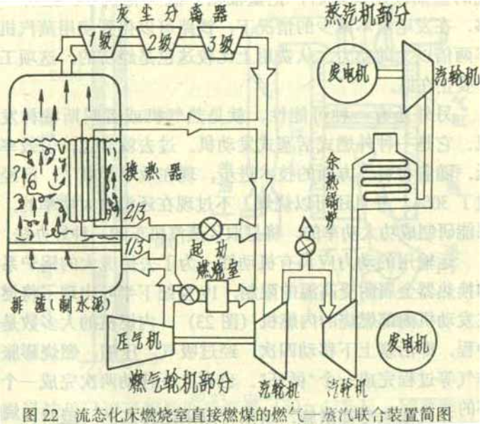 這種聯(lián)合裝置在發(fā)電上已大力發(fā)展。因?yàn)槿細(xì)廨啓C(jī)可以在高溫下使用,它是在機(jī)內(nèi)燃燒,與蒸汽輪機(jī)不一樣,對(duì)氣輪機(jī)葉片采取冷卻措施,可以耐受高的溫度,在1000℃以上的高溫下工作。它的排氣溫度為500~600℃,也比較高,正好可以到余熱鍋爐中去產(chǎn)生蒸汽,帶動(dòng)蒸汽輪機(jī)工作,蒸汽最后在冷凝器中以接近大氣的溫度冷凝成水。因此它可以在1000℃與20~30℃的溫度范圍內(nèi)工作,所以熱效率高。目前聯(lián)合循環(huán)發(fā)電效率已經(jīng)超過(guò)46%,是一般蒸汽輪機(jī)做不到的。這是熱機(jī)發(fā)展的方向。在國(guó)外這樣的聯(lián)合裝置,燃?xì)廨啓C(jī)燒的是天然氣或油,有的工業(yè)生產(chǎn)過(guò)程中就有副產(chǎn)品可燃?xì)怏w,可以用作這種裝置的燃料。我國(guó)發(fā)電全要燒煤。目前國(guó)外正在大力研究?jī)煞N燒煤的辦法:一種是流態(tài)化床燃燒室(見圖22),另一種是把煤氣化后,送到燃燒室里燃燒。