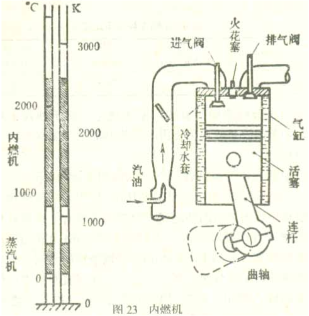 運(yùn)輸用的動(dòng)力應(yīng)具有機(jī)動(dòng)性。為了去掉龐大的鍋爐系統(tǒng)和換熱器金屬耐受高溫的限制,19世紀(jì)下半葉出現(xiàn)了將燃料在發(fā)動(dòng)機(jī)內(nèi)部燃燒的內(nèi)燃機(jī)(圖23),內(nèi)燃機(jī)的大多數(shù)是四沖程,即活塞上下移動(dòng)四次,經(jīng)過(guò)吸氣、壓縮、燃燒膨脹、排氣等過(guò)程完成一個(gè)“循環(huán)”。也有上下移動(dòng)兩次完成一個(gè)循環(huán)的,叫作二沖程。因?yàn)檫@種熱機(jī)間歇地短時(shí)間接觸燃燒氣體,并且采取冷卻措施,所以可以采用較高的(瞬時(shí))燃燒溫度如表5所示。
