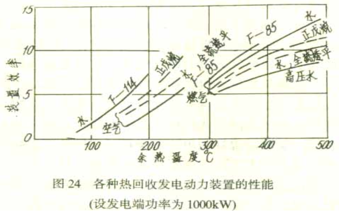 工業(yè)余能的利用,是個(gè)大問(wèn)題。我國(guó)工業(yè)耗能約占全國(guó)總能耗的三分之二,而利用效率低,大量余能白白丟掉了,今后應(yīng)該好好利用起來(lái)。余能利用的辦法與它的品位很有關(guān)系,前面介紹熱力學(xué)第二定律,已經(jīng)提到能源品位的高低對(duì)熱機(jī)熱效率的影響。例如有高溫的廢氣,溫度甚至高到1000℃以上,如果氣體壓力也比較高,那就很好利用,把它通過(guò)一個(gè)膨脹氣輪機(jī)(例如煙氣輪機(jī)),高溫高壓的氣體就可以膨脹作功。高爐煤氣、焦?fàn)t煤氣、化工工業(yè)中都有兩個(gè)大氣壓上下的高溫氣體,過(guò)去是浪費(fèi)掉了,現(xiàn)在裝上一個(gè)煙氣輪機(jī),就可以很好利用這個(gè)能量了。但是如果高溫氣體壓力只是略大于大氣壓,就不能膨脹作功,只能作為一個(gè)熱源來(lái)使用,用在封閉式的氣輪機(jī)上,或者用來(lái)產(chǎn)生蒸汽通過(guò)汽輪機(jī)發(fā)電。假如余氣的溫度低,只有300℃左右,則需應(yīng)用有機(jī)工質(zhì)的蒸汽循環(huán)(圖24),勉強(qiáng)還可以使用。從熱力學(xué)第二定律就可以看出熱效率會(huì)很低(目前不會(huì)超過(guò)8%),而設(shè)備投資比較大,回收投資的年數(shù)也就多了。要比較用熱機(jī)來(lái)發(fā)電,還是用來(lái)產(chǎn)生工業(yè)上或者生活供暖上所需要的低溫蒸汽,或熱水那一個(gè)更為合算。
