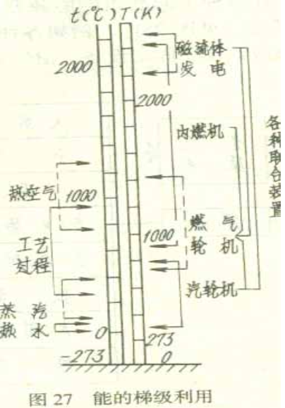 8、在能源利用方面,應(yīng)該按照基本科學(xué)原理,按照能的不同品位,按照各盡其用的原則來(lái)進(jìn)行,例如根據(jù)熱源溫度的高低選擇適當(dāng)?shù)臒釞C(jī)和熱裝置,大力發(fā)展各種聯(lián)合循環(huán)與熱電并供,余能利用等(見圖27)。