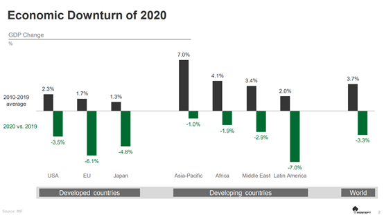 受大流行病的影響,全球經(jīng)濟在2020年出現(xiàn)了創(chuàng)紀(jì)錄的崩潰——在經(jīng)歷了每年近4%的十年增長后,全球GDP下降了3.3%,即3萬億美元,這相當(dāng)于法國和英國的GDP。