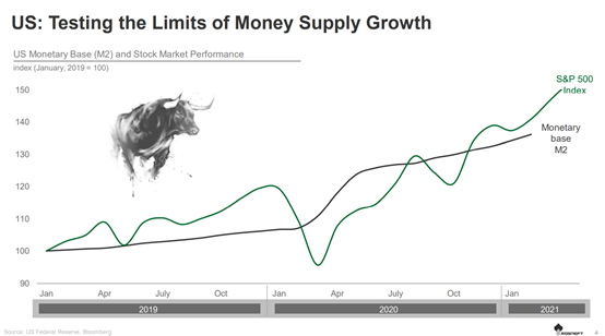以美國的貨幣增長為例。美國政府采取的行動導(dǎo)致了2020年25%的貨幣增長,這種增長將在未來一年繼續(xù)下去。這些支持經(jīng)濟的計劃,以及美聯(lián)邦儲備系統(tǒng)的量化寬松政策,對實體經(jīng)濟復(fù)蘇的貢獻(xiàn)有限。
