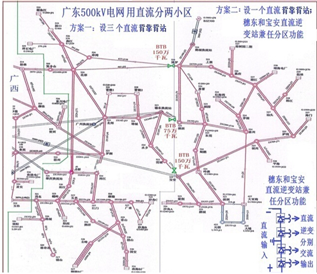 圖1 廣東500kV電網(wǎng)用直流分東西兩小區(qū)