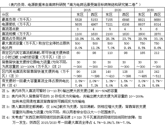 在研究分區(qū)時必須考慮一回最大容量直流一旦全停時,分區(qū)應能承受而不造成事故。直流輸電還有特別的優(yōu)點,因為在其控制系統(tǒng)中配置功率快速升降功能,當區(qū)內(nèi)有一回直流全停時,其他在運行的直流輸電和作為聯(lián)網(wǎng)的背靠背都可以快速輸出且持續(xù)短期(2小時)的1.1倍直流額定值,并可在暫時(3~10秒內(nèi))輸出更大的1.3~1.5倍直流額定值(表1未列入此支援),作為支援以補償一回最大直流全停時的負荷損失,保證直流分區(qū)的安全。上表皆假定它們?yōu)闈M負荷下只增10%作為支援,如不是滿負荷則有更大的支援,可見有很大裕度。