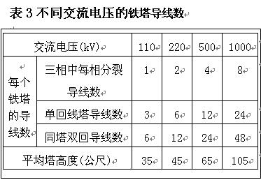 交流特高壓1000kV線不僅每相為8分裂,一回線共3×8導線,現(xiàn)在全都應用同塔雙回,共48導線(表3),而且為降低環(huán)境干擾,每相不得不選粗大又昂貴的8×630導線,它比500kV線路所取的4×400導線不僅數(shù)量多一倍,而且每根導線更重更粗,同樣的覆冰厚度,重量更重,影響更嚴重。且平均塔高97m(約為1.5倍500kV塔高),塔距又長達530m,更易受風冰影響倒塔損毀,最不安全。