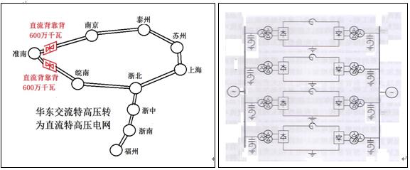 今年7月1日,華南電網(wǎng)是我國首次成功實現(xiàn)了云南送廣東的原交流500kV輸電插入直流背靠背而改進為異步聯(lián)網(wǎng),成為直流輸電,這一天云南電網(wǎng)由原"并列四直四交"改進為"八回直流"。徹底解決了原交直流并列運行時、直流故障時負荷轉(zhuǎn)移、造成交流系統(tǒng)失穩(wěn)事故。同時解決云南送出的通道"卡脖子"問題,插入直流背靠背后,云南西電東送則由1925千瓦提升至2455萬千瓦,增幅達28%。由於遠距離交流輸電一是受穩(wěn)定限制,二是易發(fā)生穩(wěn)定事故,插入直流背靠背而改為直流輸電,將得徹底解決。異步聯(lián)網(wǎng)將徹底解決遠距離交流復雜結(jié)構(gòu)的固有嚴重穩(wěn)定缺陷,將大大提高了全系統(tǒng)的安全和可控性又提高原線路的輸送能力,又解決交流短路電流距超標問題。采用同等異步聯(lián)網(wǎng)經(jīng)驗將華東交流特高壓電網(wǎng)改為直流特高壓(圖6、7)將取得如下實效: