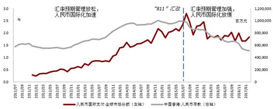 2015年9月至2017年2月,為消除人民幣貶值心魔,匯率預期管理明顯加強。人民幣國際化進程則緩中求穩(wěn),人民幣國際支付的全球份額回落至1.84%,香港人民幣存款規(guī)模下降47.76%(詳見附圖)。