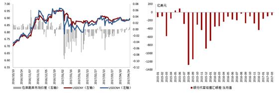 2017年人民幣在岸離岸價差、銀行代客結售匯逆差均漸次收窄 資料來源:Wind