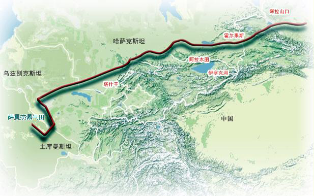 中國-中亞天然氣管道西起土庫曼斯坦與烏茲別克斯坦邊境,穿越烏茲別克斯坦中部和哈薩克斯坦南部地區(qū),在中國新疆的霍爾果斯入境。管道全長1800多公里,雙線并行。此次天然氣管道率先單線通氣,2010年將實現(xiàn)雙線通氣。項目全面竣工后,在30年的運營期內(nèi),每年將從中亞地區(qū)向中國穩(wěn)定輸送約300億立方米的天然氣,相當(dāng)于2007年我國國內(nèi)天然氣總產(chǎn)量的一半左右。