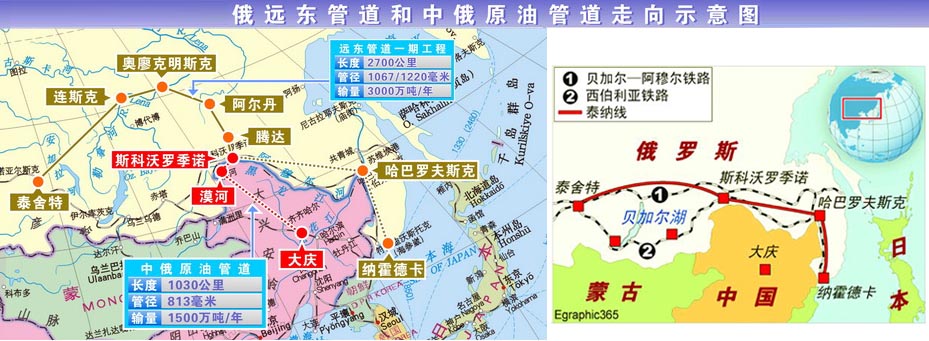 | 2004年3月3日 | 俄羅斯國營石油運(yùn)輸公司公布遠(yuǎn)東石油管道“新方案”:計(jì)劃修建兩條管道,一條通往納霍德卡,另一條分管道通往中國,管道起點(diǎn)是貝加爾--阿穆爾鐵路的樞紐泰舍特,并上報(bào)政府審批。 |