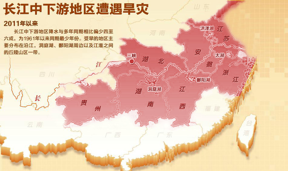 異常天氣現(xiàn)象是造成長江中下游嚴(yán)重干旱的“禍?zhǔn)住。湖北省氣象局武漢區(qū)域氣候中心副主任周月華說,受拉尼娜氣候現(xiàn)象(赤道太平洋東中部海面溫度持續(xù)異常偏冷)的影響,自去年底以來大氣環(huán)流出現(xiàn)異常。西太平洋副熱帶高壓勢力整體偏弱,暖濕氣流無法深入到長江中下游地區(qū),造成長江中下游大部分地區(qū)降雨偏少。但一些基層水利干部反映,天災(zāi)之外還有不少人為影響因素…