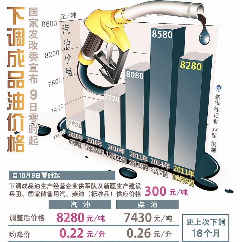 | 2011年10月09日 | 汽柴油價格每噸下調(diào)300元 | 2011年04月07日 | 汽柴油價格每噸上調(diào)500和400元 |