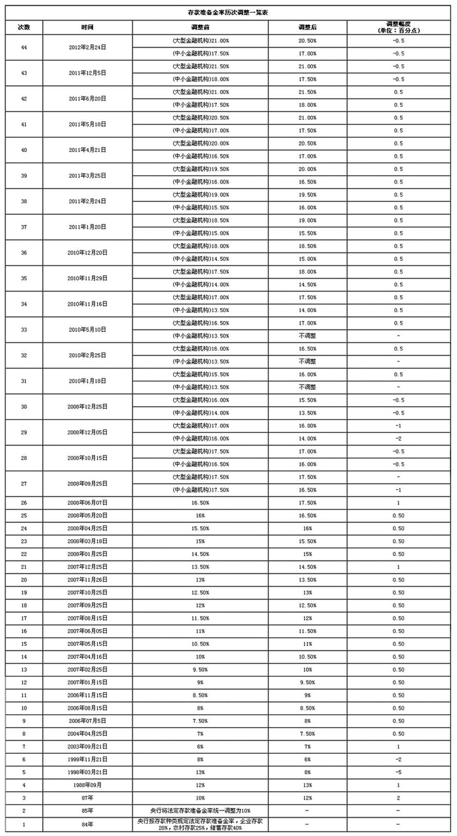 存款準(zhǔn)備金率歷次調(diào)整一覽表