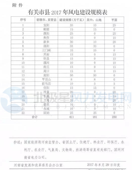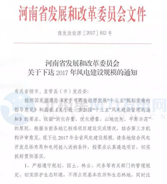 河南省發(fā)改委近日印發(fā)《關(guān)于下達(dá)2017年風(fēng)電建設(shè)規(guī)模的通知》。方案涉及22個(gè)項(xiàng)目共411萬(wàn)千瓦,其中山地風(fēng)電181萬(wàn)千瓦,平原風(fēng)電230萬(wàn)千瓦。凡出現(xiàn)棄風(fēng)棄電的市縣,不再安排年度新增規(guī)模。以下為通知原文: