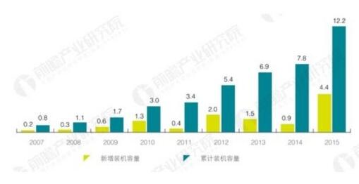 2007-2015年全球陸上風(fēng)電新增與累計(jì)裝機(jī)容量(單位:GW)