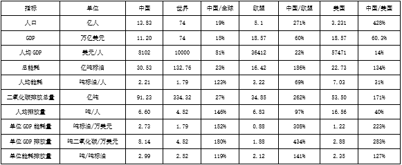 盡管我們已經(jīng)是全球第二大經(jīng)濟(jì)體,但是我們的人均GDP與發(fā)達(dá)國(guó)家還存在巨大差距,甚至與世界平均水平仍有不小的差距。而人均能耗和人均二氧化碳排放都大大超越了全球的平均水平,人均能耗是全球的1.23倍,人均排放是全球的1.46倍。而單位GDP能耗我們中國(guó)是歐盟的3.1倍,是美國(guó)的2.24倍,全球的1.53倍;單位GDP排放我們是歐盟的4.34倍,美國(guó)的2.83倍,全球的1.8倍。