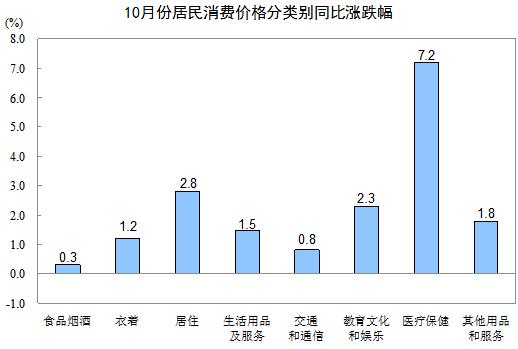 10月份,其他七大類(lèi)價(jià)格同比均上漲。其中,醫(yī)療保健、居住、教育文化和娛樂(lè)價(jià)格分別上漲7.2%、2.8%和2.3%,其他用品和服務(wù)、生活用品及服務(wù)價(jià)格分別上漲1.8%和1.5%,衣著、交通和通信價(jià)格分別上漲1.2%和0.8%。