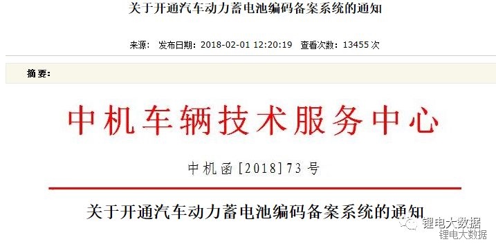 2月1日,中機(jī)中心發(fā)布《關(guān)于開(kāi)通汽車動(dòng)力蓄電池編碼備案系統(tǒng)的通知》,要求從事汽車動(dòng)力蓄電池(含梯級(jí)利用)生產(chǎn)、在中國(guó)境內(nèi)銷售動(dòng)力蓄電池產(chǎn)品的獨(dú)立法人企業(yè)按照《汽車動(dòng)力蓄電池編碼規(guī)則》(GB/T34014-2017)和通知的要求,通過(guò)“汽車動(dòng)力蓄電池編碼備案系統(tǒng)”,申請(qǐng)廠商代碼,并備案編碼中“規(guī)格代碼”和“追溯信息代碼”的編制規(guī)則。