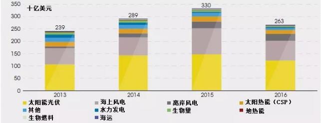 2013—2016年全球可再生能源不同技術(shù)類型的年度投資