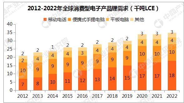 鋰離子電池在儲能領(lǐng)域的應(yīng)用越來越廣泛。除了電動交通領(lǐng)域外,鋰電池在消費型電子產(chǎn)品方面的應(yīng)用也十分重要。在過去十年中,消費型電子產(chǎn)品(主要為智能手機、便攜設(shè)備及筆記本電腦)的快速普及促進鋰化合物的上一波需求增長,2012年至2017年的復合年增長率為7%。未來,消費型電子產(chǎn)品仍將為一項重要應(yīng)用,預計2017年至2022年該分部的復合年增長率將達5%。