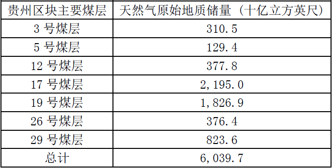 截至2016年底,NetherlandSewell&Associates(NSAI)所提供貴州區(qū)塊主要煤層的天然氣原始地質(zhì)儲(chǔ)量、資源儲(chǔ)量獨(dú)立估計(jì)值列表如下: