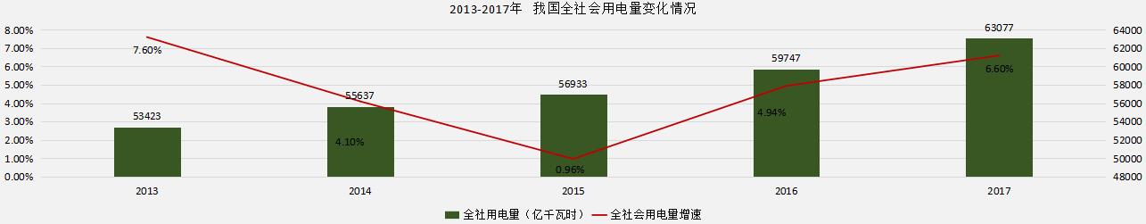 根據(jù)國家能源局公布2017年我國電力工業(yè)運行數(shù)據(jù)顯示,2017年,我國全社會用電量63077億千瓦時,同比增長6.6%。