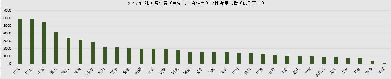 從全社會用電量總量上看,2017年,我國各個省(自治區(qū)、直轄市)全社會用電量東高西低的情況依然加劇。