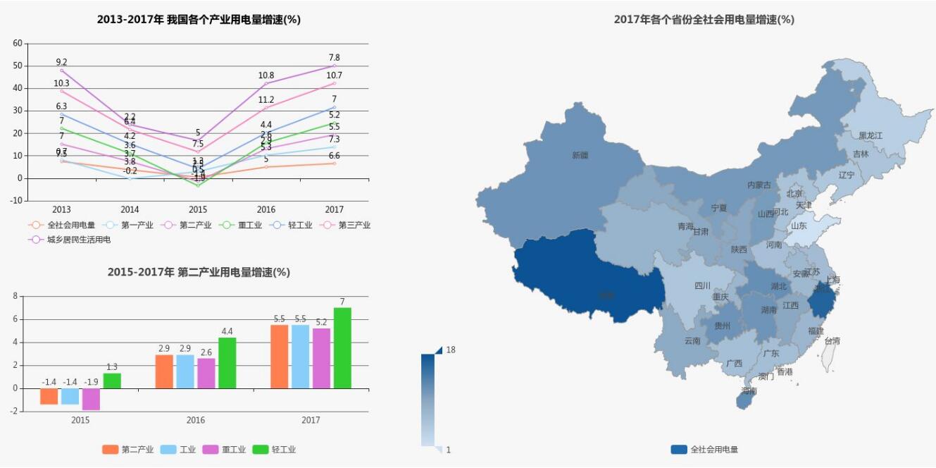從全社會用電量增速上看,2017年,我國各個省(自治區(qū)、直轄市)全社會用電量已經(jīng)出現(xiàn)全面增長的局面。