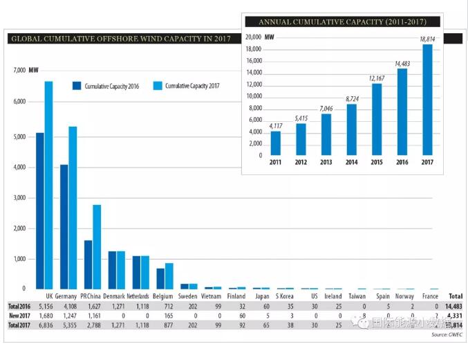 根據(jù)全球風(fēng)能理事會(huì)的數(shù)據(jù),2017年全球新增海上風(fēng)電裝機(jī)4.331吉瓦,累計(jì)裝機(jī)達(dá)到18.814吉瓦,比2016年總裝機(jī)(14.483吉瓦)增長(zhǎng)30%。其中新增海上風(fēng)電裝機(jī)最多的3個(gè)國(guó)家是:德國(guó)(+1.680吉瓦)、英國(guó)(1.247吉瓦)、中國(guó)(1.161吉瓦)。