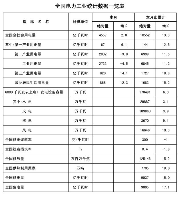 1-2月,全國全社會用電量累計10552億千瓦時,同比增長13.3%。分產(chǎn)業(yè)看,第一產(chǎn)業(yè)用電量144億千瓦時,同比增長12.6%;第二產(chǎn)業(yè)用電量6999億千瓦時,增長11.5%;第三產(chǎn)業(yè)用電量1727億千瓦時,增長18.8%;城鄉(xiāng)居民生活用電量1683億千瓦時,增長15.2%。