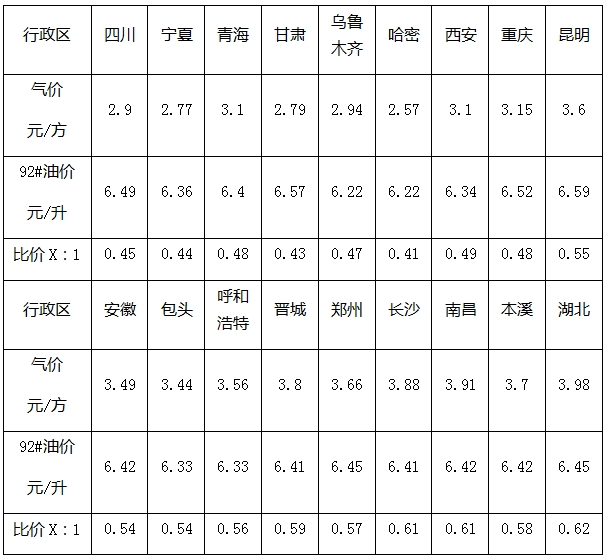 說明:盡管四川CNG統(tǒng)一售價為2.9元/立方米,但綿陽一些加氣站自發(fā)下調(diào)為2.60元/立方米(“油氣比價”實為0.4),自貢也有加氣站降至2.70元/立方米和2.55元/立方米(“油氣比價”實為0.42和0.39)