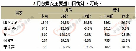 3月份出口中國煤炭274萬噸,環(huán)比增39.2%,同比增6.3%。1-3月份累計(jì)出口中國煤炭735萬噸,同比上漲12.5%。