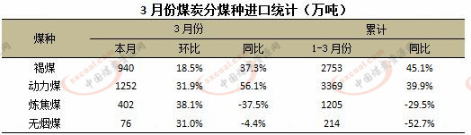 分煤種看 3月份中國進(jìn)口煤炭最大量的煤種為動(dòng)力煤,占全部進(jìn)口煤炭的46.9%;排在第二位的為褐煤,占比為35.2%。其次為煉焦煤,占比為15.1%。