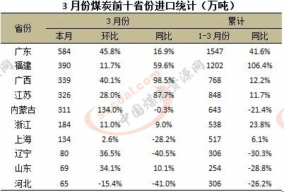 分省份看:3月份進(jìn)口量排在前五位的省份為廣東、福建、廣西、江蘇及內(nèi)蒙古。上述五省共進(jìn)口煤炭合計(jì)1949萬噸,環(huán)比增41.4%,同比增39.2%,上述五省進(jìn)口煤炭總量占中國全部進(jìn)口煤炭的73.0%。