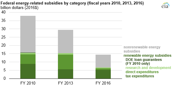 2016財(cái)年可再生能源占聯(lián)邦能源補(bǔ)貼總額的比例為45%,低于2013年的52%。