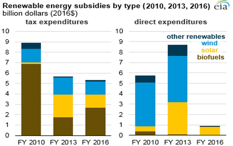 聯(lián)邦政府對(duì)能源的補(bǔ)貼包括稅收支出,直接支出,研發(fā)和信貸補(bǔ)貼給聯(lián)邦貸款擔(dān)保的接受者。第一類在2016年占可再生能源補(bǔ)貼的80%,約56億美元。其中,生物燃料占51%,緊隨其后的是大型風(fēng)能和太陽能園區(qū)的生產(chǎn)稅收抵免(PTC)和投資稅收抵免(ITC)。