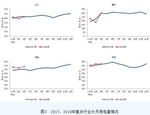 4月份,四大高載能行業(yè)用電量合計1576億千瓦時,同比增長2.9%,占全社會用電量的比重為30.2%。其中,化工行業(yè)用電量365億千瓦時,與上年基本持平;建材行業(yè)用電量302億千瓦時,同比增長0.7%;黑色金屬行業(yè)用電量438億千瓦時,同比增長9.5%;有色金屬冶煉行業(yè)471億千瓦時,同比增長0.9%。