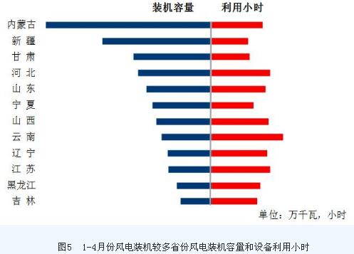 分類型看,1-4月份,全國水電設(shè)備平均利用小時為845小時,比上年同期降低26小時。在水電裝機容量超過1000萬千瓦的8個省份中,湖南、云南、廣東和四川同比分別降低371、64、60和12小時,貴州、廣西、青海和湖北同比分別增加213、141、139和34小時;全國火電設(shè)備平均利用小時為1426小時(其中,燃煤發(fā)電設(shè)備平均利用小時1467小時),比上年同期增加69小時。分省份看,全國共有12個省份火電設(shè)備利用小時超過全國平均水平,其中陜西、江西、河北和青海超過1600小時,內(nèi)蒙古、安徽、寧夏、甘肅和江蘇超過1500小時,云南和西藏分別僅為708和94小時。與上年同期相比,全國共有24個省份火電利用小時數(shù)同比增加,其中,福建同比增加超過400小時,增加416小時,云南、湖南、廣東和重慶同比增加超過200小時,分別增加290、258、223和220小時,而江蘇、北京、山東、新疆、貴州、河北和寧夏同比降低,其中江蘇、北京和山東同比分別降低128、125和125小時;全國核電設(shè)備平均利用小時2287小時,比上年同期增加62小時;全國并網(wǎng)風(fēng)電設(shè)備平均利用小時812小時,比上年同期增加150小時;全國太陽能發(fā)電設(shè)備平均利用小時410小時。