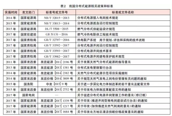 我國分布式能源產(chǎn)業(yè)發(fā)展過程與國外相似,政策從宏觀性鼓勵到實質(zhì)性支持,對分布式能源產(chǎn)業(yè)的健康發(fā)展起到重要的推動作用。2011年之后,我國分布式能源產(chǎn)業(yè)政策密集發(fā)布,支持力度也逐步具有實質(zhì)性。為了進一步做好分布式能源項目前期準(zhǔn)備工作,現(xiàn)梳理我國現(xiàn)行主要政策和標(biāo)準(zhǔn),項目投資、建設(shè)單位應(yīng)當(dāng)充分研讀這些文件。我國分布式能源相關(guān)政策和標(biāo)準(zhǔn)見表2,表2中的“—”表示無文件號。